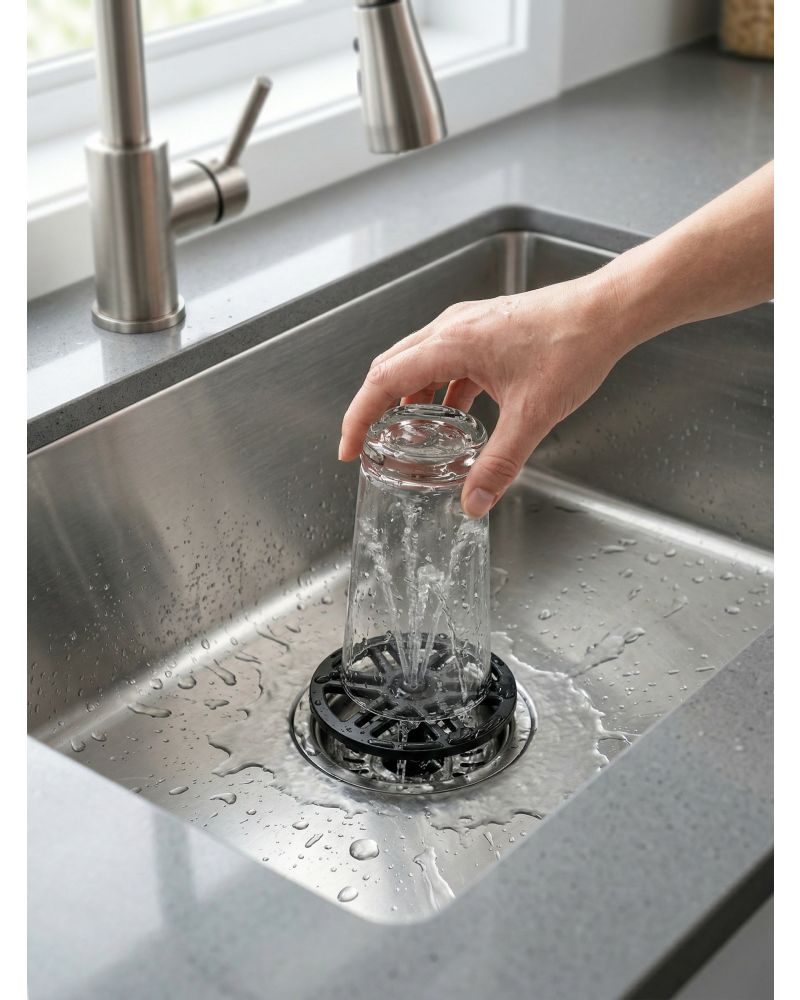 Bardak ve sürahileri hızla durulayın. Evye giderine monte edilir, bardakları ters çevirip basınçlı su ile temizler.